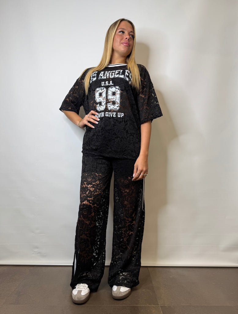 Coordinato in pizzo maglia t-shirt inver con scritta semitrasparente panatalone a palazzo con fodera a pantaloncino sotto colore unico taglia unica calza da 42 a 46