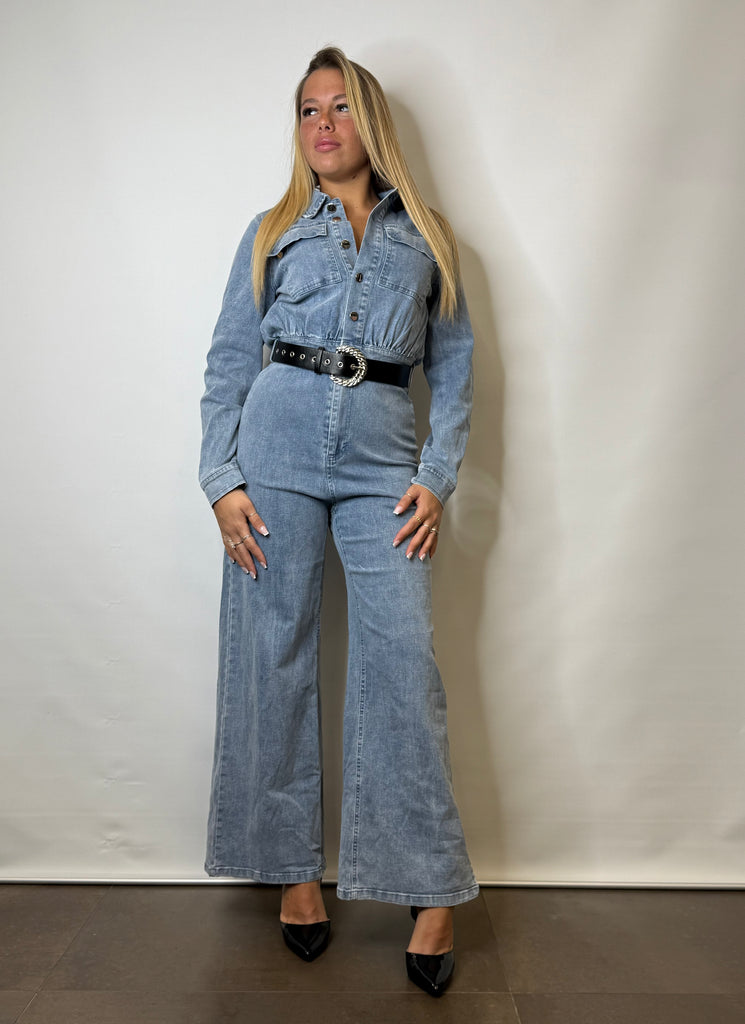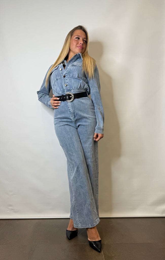 Tuta jeans manica lunga a zampa comprensiva di cintura nera tessuto elastico taglia s m l colore unico
